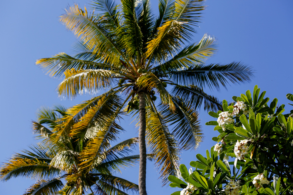 Le cocotier est sûrement le palmier le plus connu, symbole des tropiques. Levez les yeux et vous verrez probablement ses noix pendre au-dessus de vous. Ce palmier ne donne des fruits qu’après de nombreuses années. A la Réunion, on vous affirmera que celui qui plante un cocotier mourra avant que l’arbre ne fructifie. Et pour qu’il donne beaucoup de cocos, il faut mettre une pièce de monnaie avant de le planter dans le trou que l’on a creusé. Bien sûr, il est préférable de ramasser les noix à la pleine lune, elles n’en seront que plus pleines.
