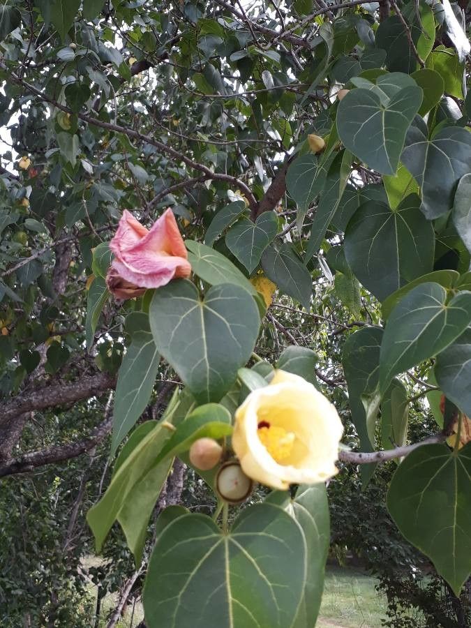 En entrant dans le Jardin, le bois de peinture ou Porcher (Thespesia populnea) vous présente ses fleurs jaunes et fuchsias. Sa fleur dure une journée. Elle s’ouvre avec une coloration jaune pâle et 5 points marron au fond de la corolle et devient progressivement rose puis pourpre ou rouge en fin de journée. Le fruit est une capsule verte qui prend une coloration noire puis marron à maturité et qui contient environ 6 graines.