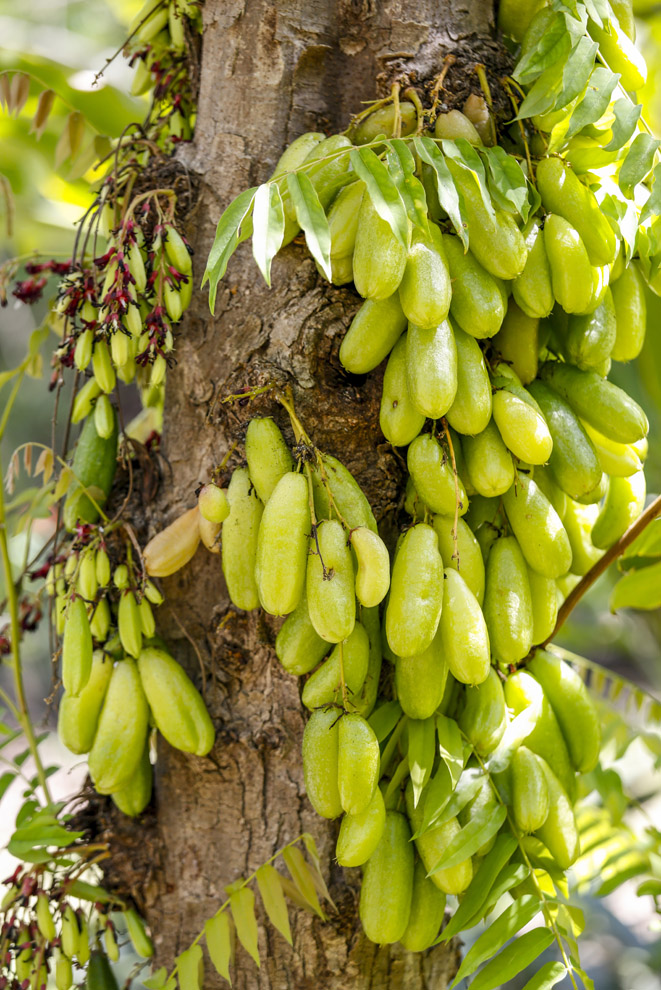 Les fleurs naissent sur le tronc et les branches de manière un peu anarchique. Elles forment des grappes rameuses d’une belle longueur. La fructification est abondante.