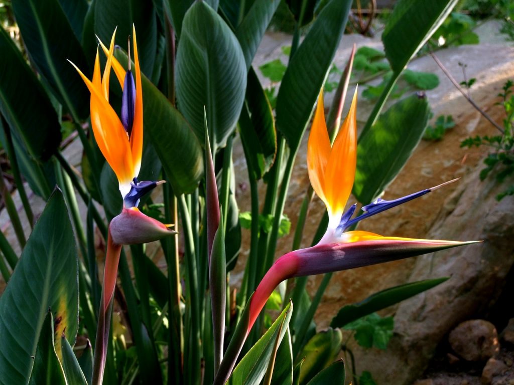 En provenance d’Afrique du Sud, l’oiseau du paradis porte ce nom car sa fleur ressemble curieusement à une tête d’oiseau.