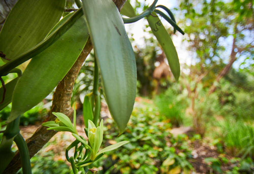 La vanille est une orchidée originaire du Mexique, où ses fleurs sont fécondées par des « mélipones » (sorte d’abeilles) et donnent des gousses très appréciées pour leur arôme. Malheureusement hors du Mexique, pas de « mélipones ». L’homme doit alors lui-même réaliser le contact entre les organes mâles et femelles de la plante. En 1841, l’esclave créole Albius découvrit les gestes qui permirent de réaliser cette fécondation artificielle, ce qui a lancé le développement de cette production dans l’Ile. Et avec bonheur, car la vanille Bourbon est de qualité mondialement reconnue.