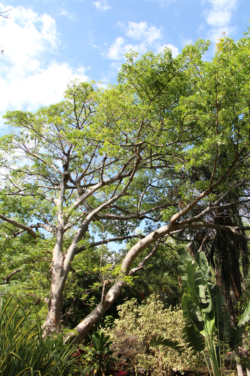 Notre Bombax Ceiba L. est classé parmi les arbres remarquables de La Réunion par l’application MOABI. Il donne de grandes fleurs de couleur rouge écarlate qui sont composées de cinq pétales et de nombreuses étamines également rouges. Elles s'épanouissent sur l'arbre alors que celui-ci est généralement dénué de feuilles. Vous rencontrerez son cousin, le fromager en quittant le jardin. Cette famille se distingue pour ses fruits source de kapok, une fibre végétale très particulière. Le kapokier rouge a un bois très léger utilisé pour la production d’allumettes.
