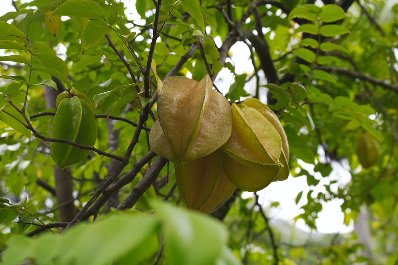 En allant vers les ruches, Le carambolier (Averrhoa carambola) est un arbre des régions tropicales qui peut porter ses fruits dès l’âge de 5 ans. Selon les variétés, plus ou moins acidulées, le fruit est utilisé en jus ou en salade de fruits, en confiture ou dans des sauces ; mais il sert surtout pour décorer les plats et les desserts. Il surprend par sa forme particulière et sa peau à l’aspect cireux. Coupé transversalement, il a la forme d’une étoile à 5 branches, ce qui lui vaut le nom de Star Fruit en anglais.