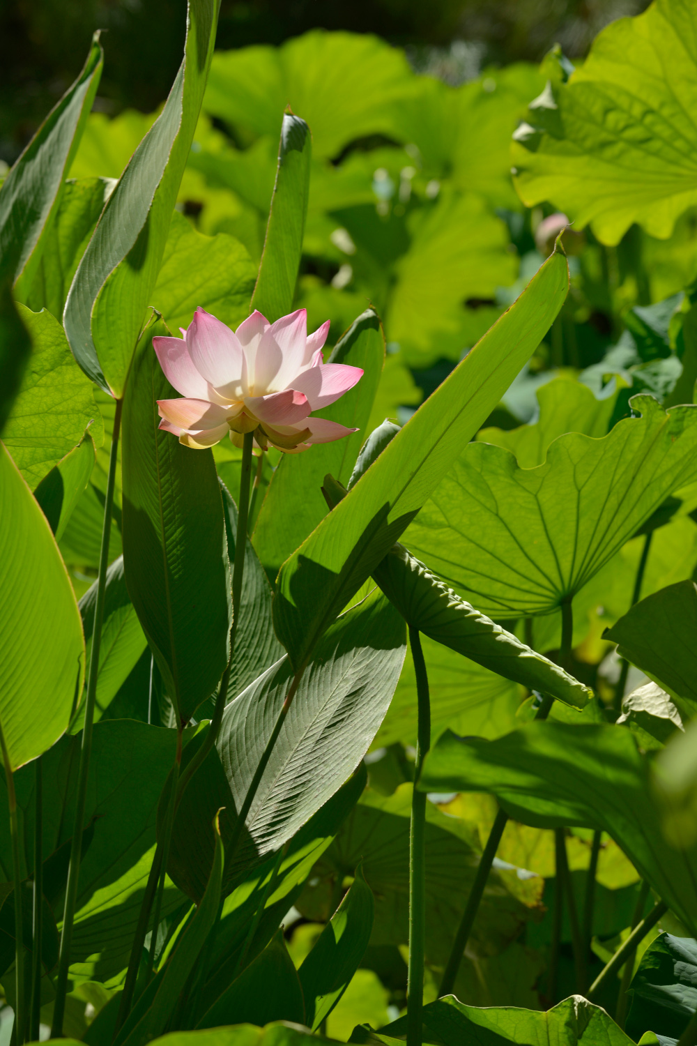 Entre novembre et mars, vous auriez pu découvrir le lotus sacré (Nelumbo nucifera Gaertn) en fleur. Ouverte le jour, la fleur de lotus se ferme la nuit et sa longévité n’est que de quelques jours. C’est une plante aquatique qui aime la chaleur. Sa multiplication se fait par division des rhizomes et tubercules mais on peut aussi la multiplier par ses graines. Les feuilles elles-mêmes sont comme de larges réceptacles mais contrairement à celles du nénuphar, elles émergent nettement au-dessus de la surface de l’eau.